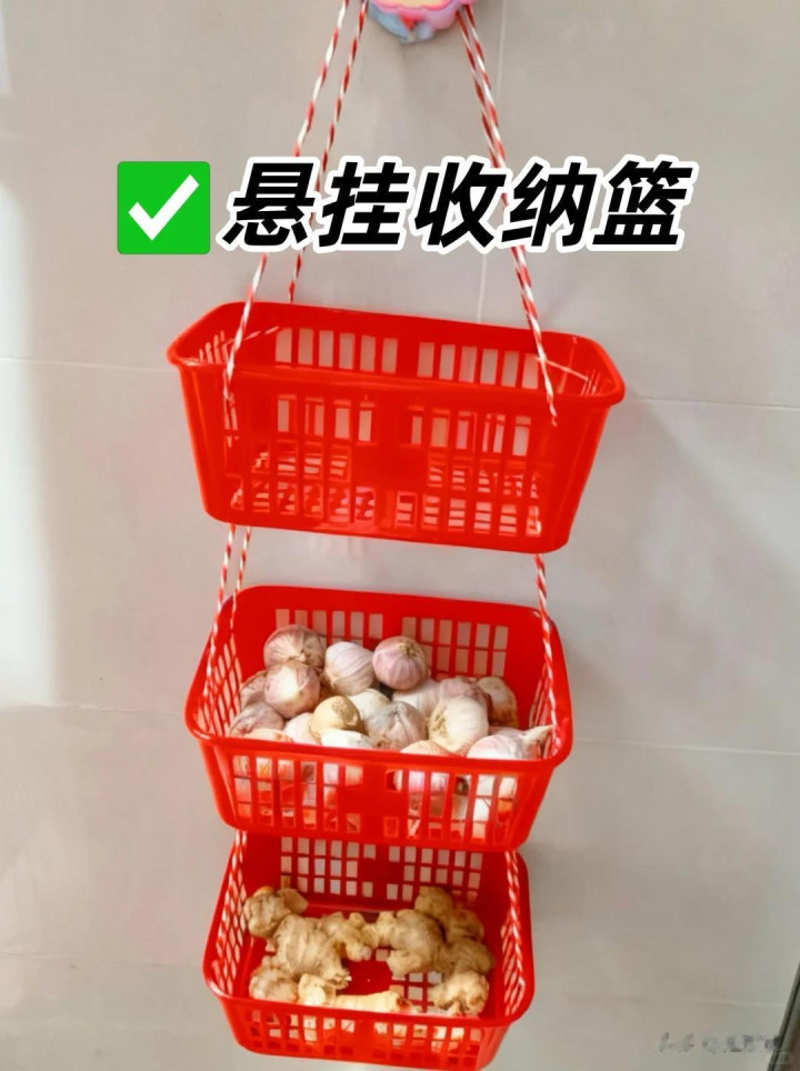 要是莫得收纳小推车,你也不错将这些草莓筐用线穿起来,变成一个吊挂的收纳篮,。不错放大蒜,生姜,又省空间又透气。