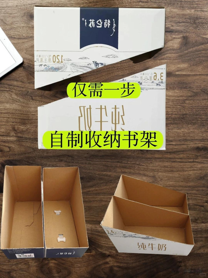 成箱买牛奶,喝完牛奶之后,剩下的这个牛奶箱也不要惊悸扔掉,牛奶箱也一样不错再行再运用,咱们不错将牛奶箱更正成一个桌面书架。