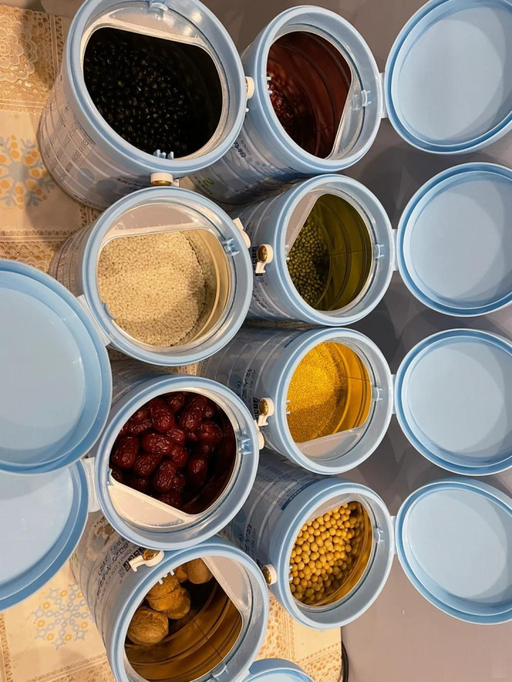 孩子喝奶粉剩下的奶粉桶莫得扔掉,刷洗干净之后,也不错放在家里再行再运用,咱们不错使用奶粉桶来分装厨房的五谷杂粮,这些奶粉桶都是不错径直装食品的,极度安全。