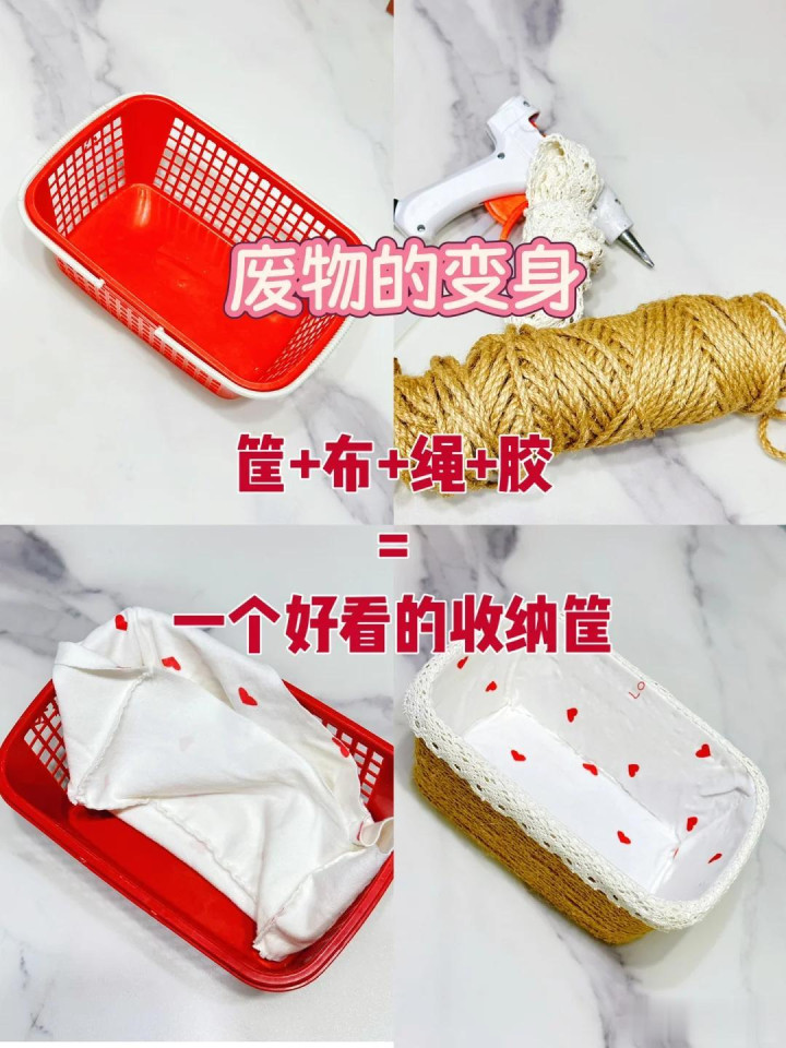 用家里不穿的旧衣着,将它剪辑安妥的尺寸,然后包裹在草莓框的外边,使用麻绳热熔胶固定就不错了,立马变成一个高颜值的收纳筐。