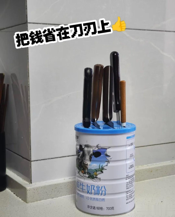 奶粉桶还不错更正成一个刀具架,租房临时过渡的屋子,无谓用钱去买刀架,使用奶粉桶,在盖子上头开几个安妥的口,就能当刀架来使用。