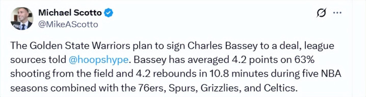 北京时刻4月5日,据定约音信东说念主士向HoopsHype显露,金州英豪队权谋签下查尔斯-巴锡。25岁巴锡是2021年的53号秀,他在NBA遵循的五个赛季里,先后在76东说念主、马刺、灰熊和凯尔特东说念主队打球,场均出战10.8分钟,获取4.2分4.2篮板,投篮射中率63%。