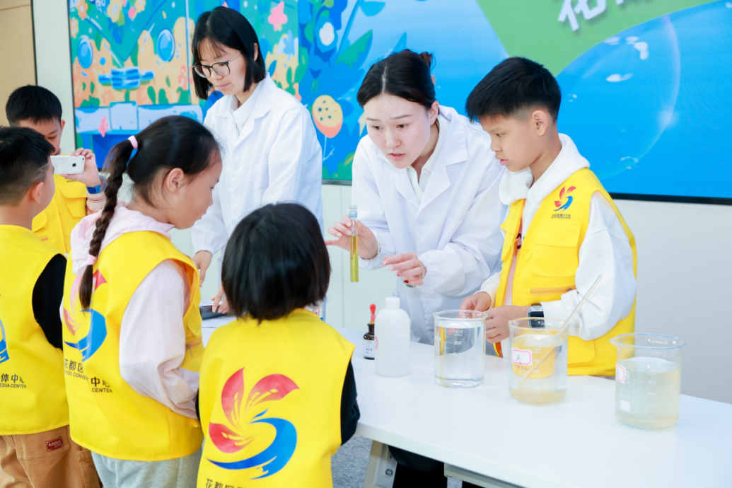 在随后的“水质小课堂”方法,孩子们在水质检测员的开拓下,亲手操作pH值检测等水质小实验。