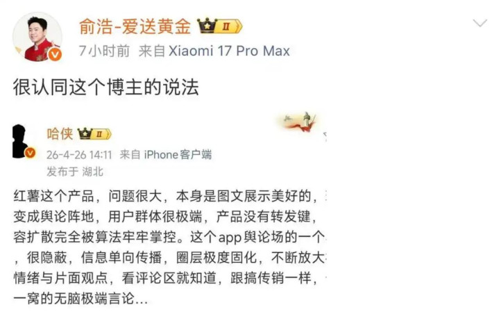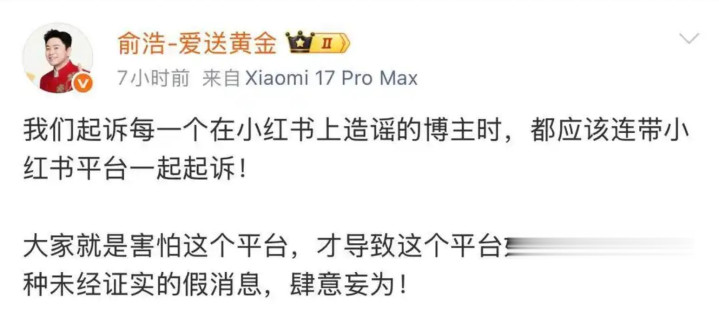 4月26日,追觅科技首创东谈主兼CEO俞浩连发三条微博,锋芒直指小红书;用词特别强烈,比如称“小红书是一个特别特别烂的平台!社会价值不雅导向特别特别烂!”或者是“群众等于发怵这个平台,才导致这个平台如斯狂放推送各式未经证实的假音信,狂放妄为!”