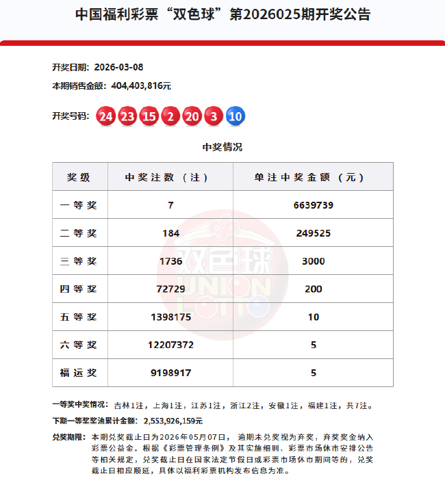 福彩开奖直播截图北京时期2026年3月8日,福彩双色球第26025期开奖,当期开奖号码为红球02 03 15 20 23 24,蓝球10。本期一等奖开出7注,单注奖金663万元;二等奖开184注,单注奖金24万。此外,因开奖前奖池高于15亿,增设5元福运奖(掷中3枚红球即中奖),共开出9198917注。本期双色球销量为4.04亿余元,奖池余额25.53亿余元。