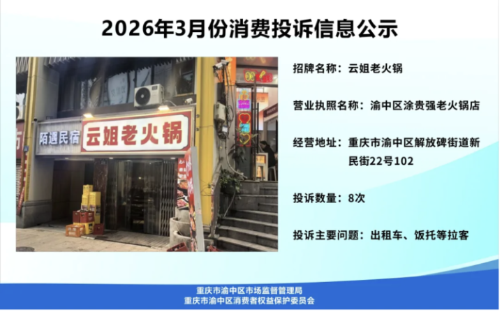 4月10日,渝中区阛阓监督处置局、渝中区消委会纠合公示了2026年3月拉客类投诉较多的餐饮主体名单。渝中区3月收到出租车、网约车及假志愿者等饭托拉客到餐饮主体的赔本投诉118件,逼近透露开拓赔本、食物安全、价钱虚高三大问题。5家暖锅店被点名曝光,涉诉量最高达19次。
