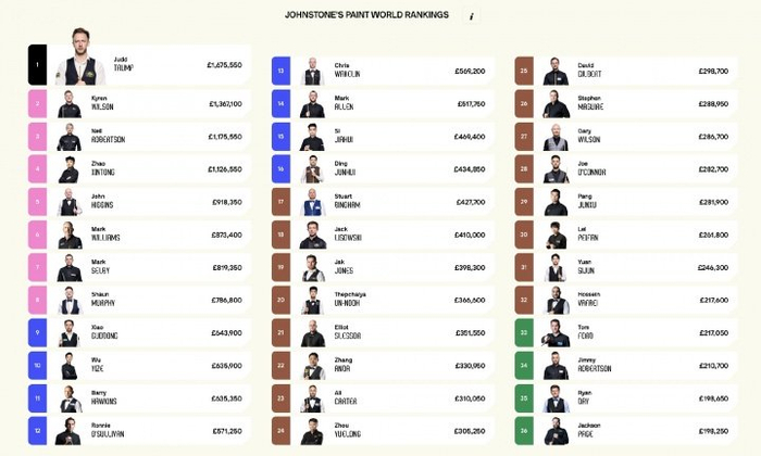 WST官网稳当更新宇宙排行,赵心童排行高潮一位,初度稳当置身宇宙前四!赵心童的的奖金积分达到1,126,550镑,宇宙第一特鲁姆普的奖金积分是1,675,550镑,M6体育进出54.9万镑。